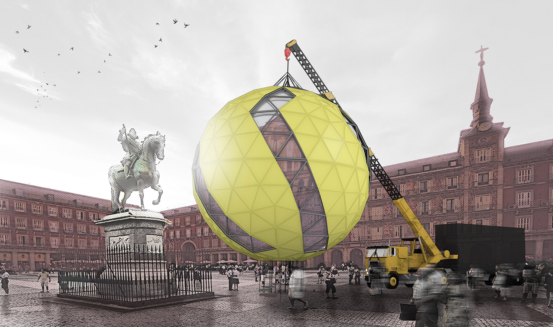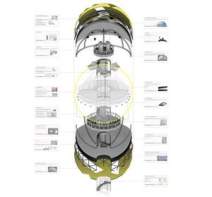 There was no choice, we had to discover what was that “ovni”. We got close and we could discover that actually it was hanging from a crane and fixed to the ground by thin steel cables. Attached to that cable structure were placed the steps of a spiral stair… It was accessible!! We headed the staircase and went upstairs. Quickly we were swallowed by the sphere, but that place wasn’t like we thought. It was dark and narrow, with more and more steps.